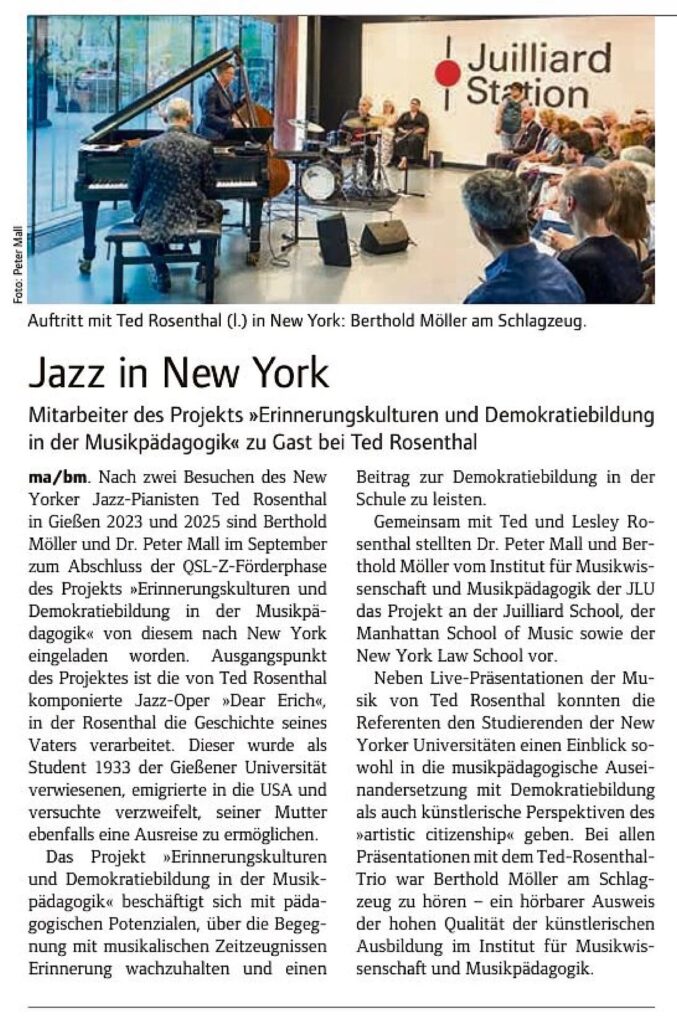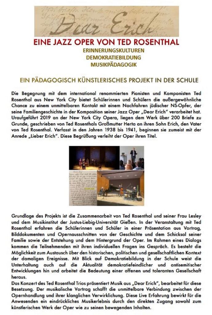 „Dear Erich“ ist ein berührendes Musikprojekt über Erinnerung und Verantwortung. In seiner Jazz-Oper erzählt der international renommierte Pianist Ted Rosenthal die Geschichte seiner jüdischen Familie und die Flucht seines Vaters Erich aus Nazi-Deutschland – auf Grundlage von über 200 Briefen aus den Jahren 1938 bis 1941.